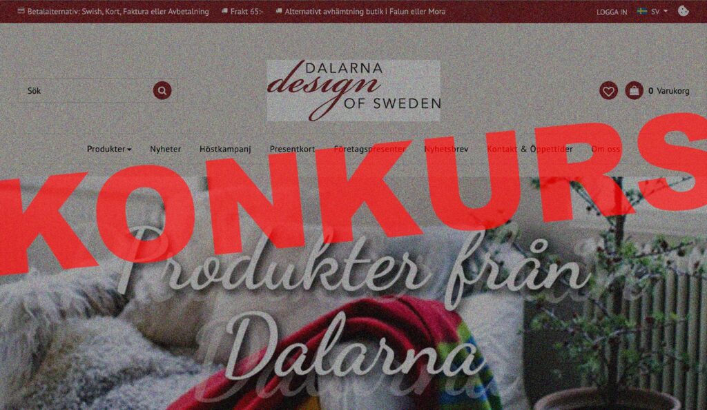 Webshoppen Dalarna Design of Sweden AB begæres konkurs af Skatteverket. Det skriver Falukuriren. Virksomheden har samlet ubetalte gæld, lukket sin webshop og modtaget mange anmeldelser fra købere, der er blevet snydt for deres leverancer.